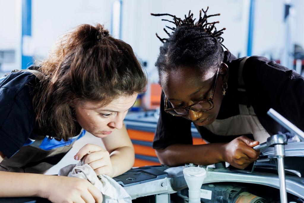 Stock blunt-tip scissors, low-temp glue guns, painter’s tape, and labeled bins for batteries, motors, and microcontrollers. Clear trays prevent lost screws, and a soft mat catches rolling parts. Invite kids to help organize and suggest improvements.